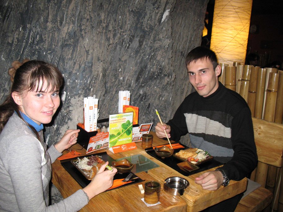 Несмотря на холодную погоду, мы долго гуляли по городу. Перекусили в японском ресторане и, прогуливаясь на Чистых прудах, я наконец решился подарить колечко и задать главный вопрос, на который получил положительный ответ.